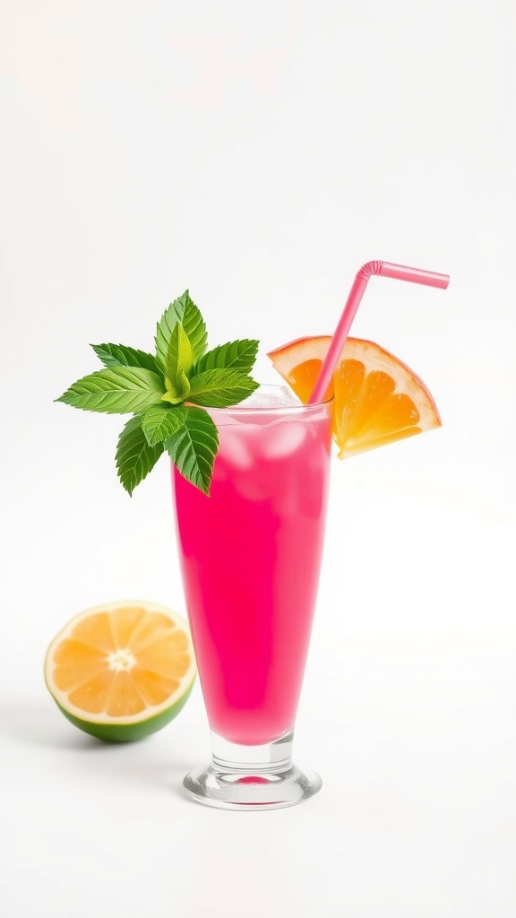 A vibrant cocktail with a straw and flowers surrounding it