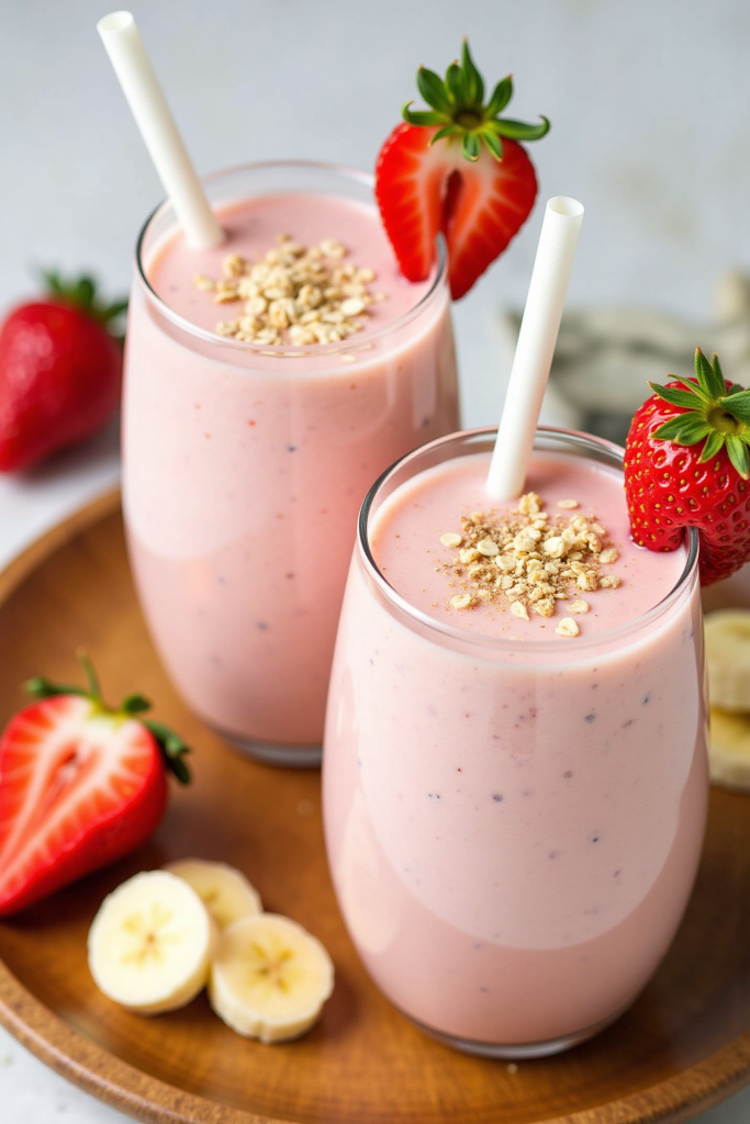 - Pour into two glasses, garnish with fresh strawberries or a sprinkle of granola, and serve immediately.