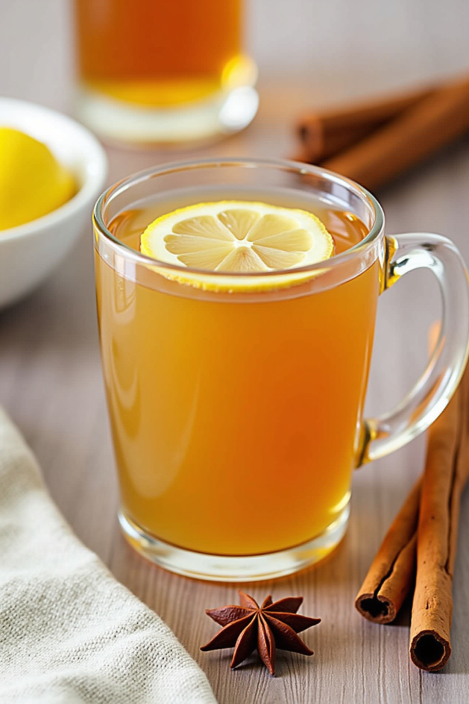 4. Garnish with a round of lemon, a cinnamon stick, or a few cloves on a lemon slice. Add a star anise or fresh herb sprig for extra flair, if desired.