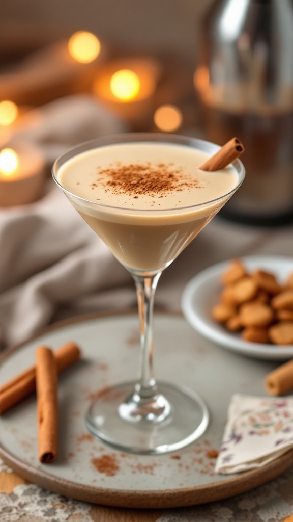 3. Serve: Strain the mixture into a chilled martini glass. Garnish with a cinnamon stick or a sprinkle of ground cinnamon. For an elegant touch, add a star anise on top.
