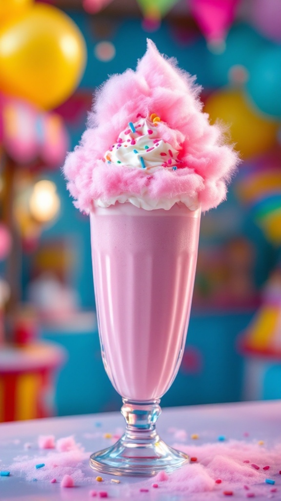 - Serve: Pour the milkshake into tall glasses. Top with whipped cream, extra cotton candy, and colorful sprinkles for a festive touch.