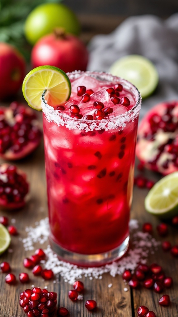 The rustic wooden background, along with scattered fresh pomegranates and lime halves, enhances the inviting presentation. This setting not only highlights the drink’s beauty but also creates a festive atmosphere, perfect for any occasion.
