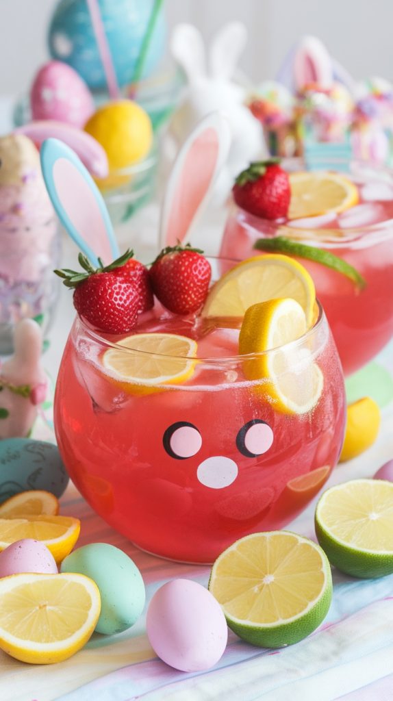 A bowl of Easter Bunny Punch garnished with slices of strawberries, lemons, and limes is visually stunning. The colorful presentation becomes a centerpiece that complements the celebratory mood of the day. Set against a festive tablecloth, the punch bowl invites guests to gather around and fill their glasses.