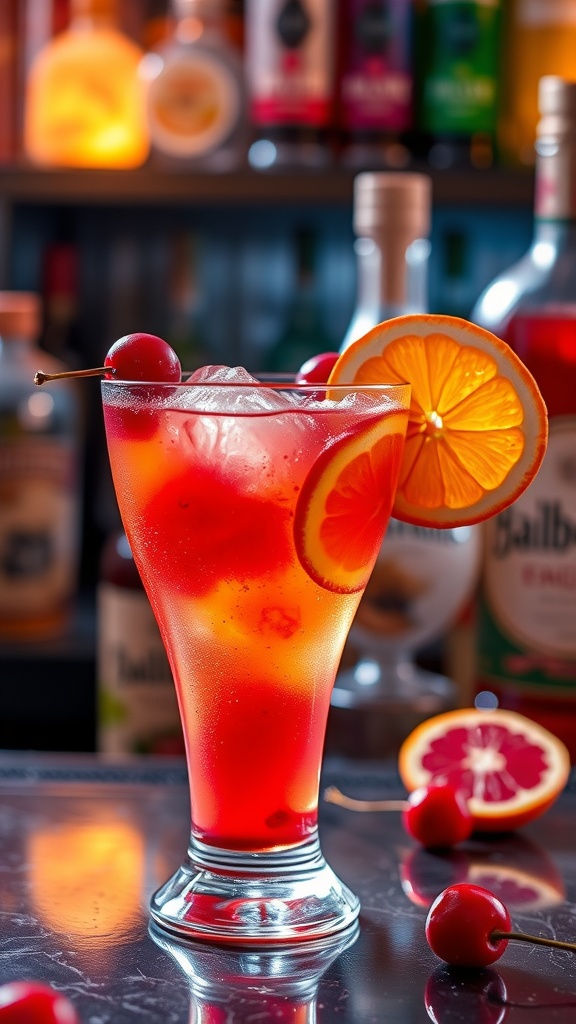 When served in a stylish cocktail glass, this drink becomes a centerpiece of any gathering, showcasing a beautiful garnish of fresh orange slices and cherries. The sparkling light dances through the liquid, further enhancing its appeal.