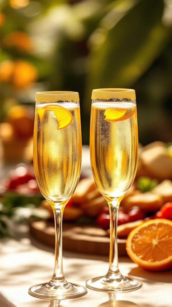 Imagine a table adorned with glistening champagne flutes filled with the golden hues of champagne and freshly squeezed orange juice. The drinks, garnished with sparkling gold sugar rims and vibrant orange slices, create an inviting scene that attracts your guests’ attention. This combination not only enhances the visual appeal but also embodies the essence of celebration.