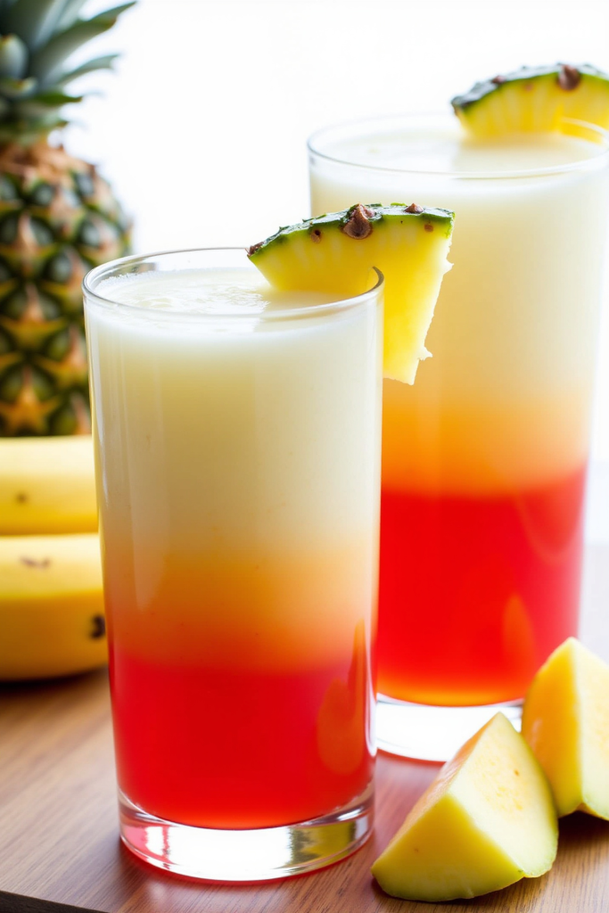 - Prepare the strawberry layer: In a blender, combine the frozen strawberries and banana. Blend until smooth, adding a splash of pineapple juice if needed for consistency. Pour the mixture evenly into the bottom of two tall glasses.