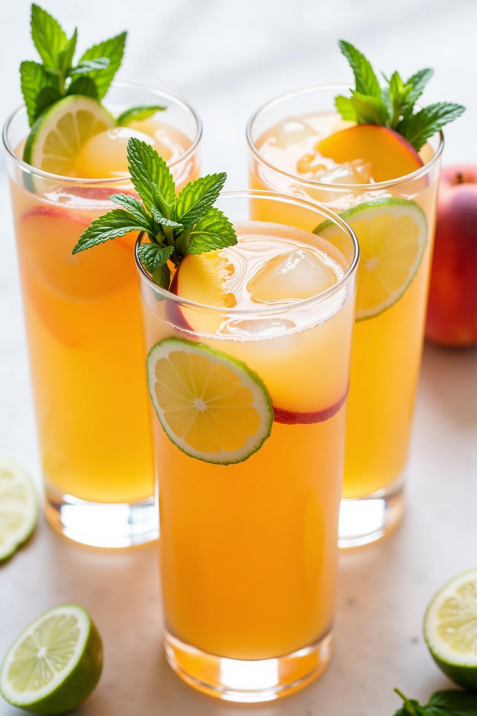 - Stir gently and garnish with additional peach slices, a lime wedge, and a sprig of fresh mint. Serve immediately.