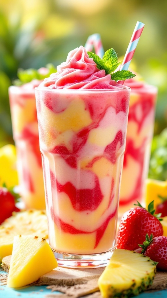 - Combine and Swirl: In serving glasses, pour a layer of the pineapple mixture, then a layer of the strawberry mixture. Use a spoon or straw to gently swirl them together for a marbled effect.