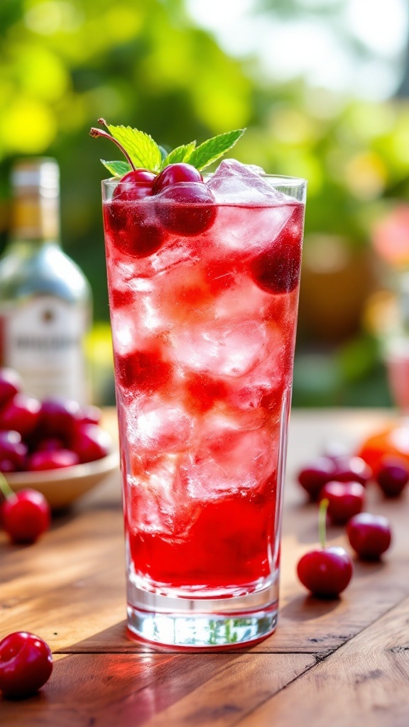 Adding soda water tops off this drink with a lively fizz, elevating the experience with every sip. The garnish of fresh cherries and mint not only looks appealing but also enhances the overall aroma, making it a treat for the senses.