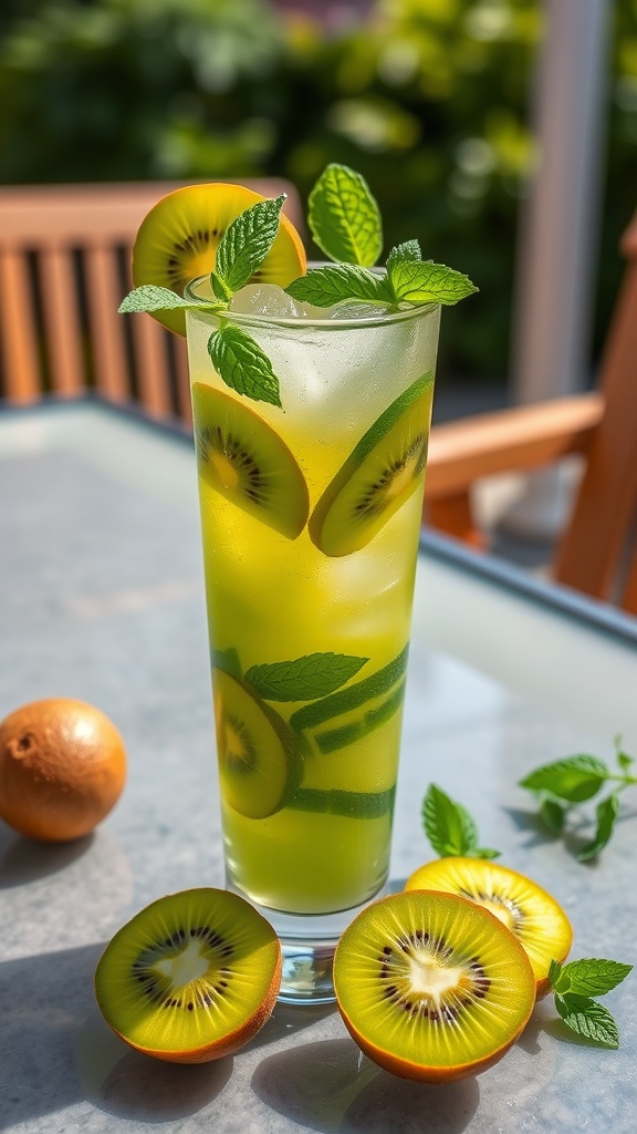 Consider setting the scene with a few fresh kiwis and mint sprigs scattered around for a bright and inviting atmosphere that complements the drink.