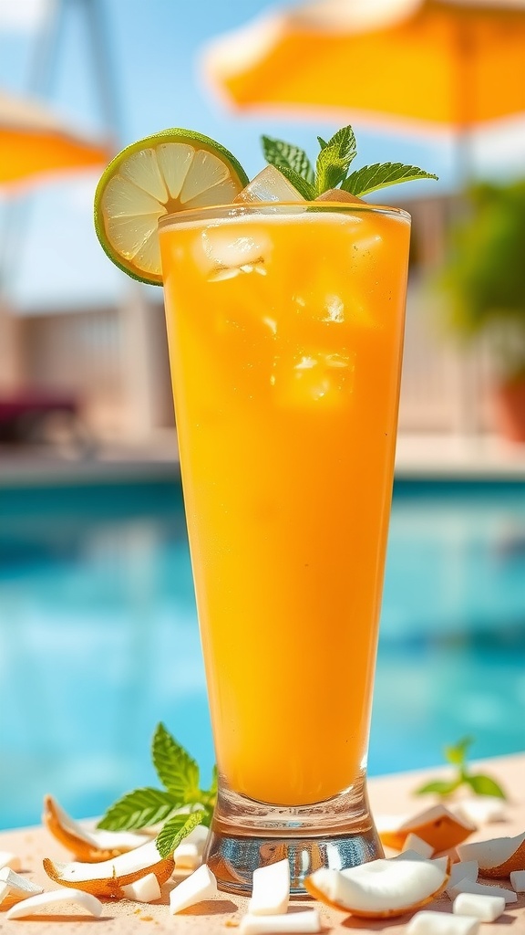 Perfect for a sunny poolside gathering or just a relaxing afternoon at home, this drink embodies the spirit of summer. With its bright yellow-orange color and the glistening ice cubes, it’s not just a beverage; it’s an experience that transports you to a tropical paradise with every sip.