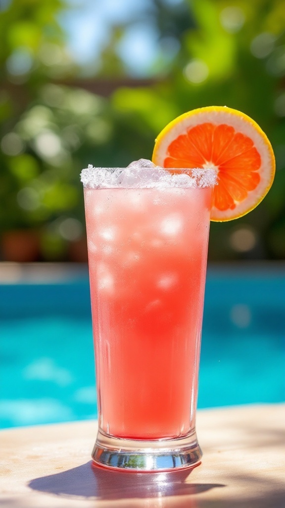 Finish off the drink with a slice of grapefruit and a lime wedge perched on the rim of the glass. This not only adds to the visual appeal but also offers a hint of the flavors to come, inviting guests to sip and enjoy. The overall presentation perfectly encapsulates the spirit of summer gatherings and the joy of poolside relaxation.