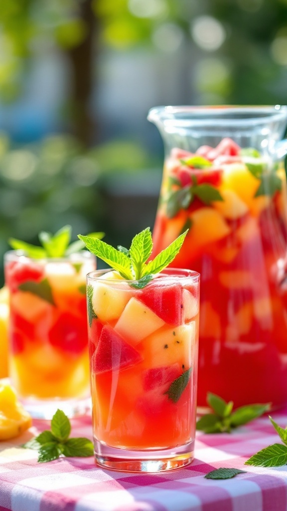 Serving this sangria with fresh mint leaves not only looks appealing but also adds an aromatic element that enhances the overall flavor profile. The green of the mint contrasts wonderfully with the bright hues of the fruits, creating an inviting presentation. This attention to detail transforms the drink into a centerpiece, making it perfect for any summer occasion.