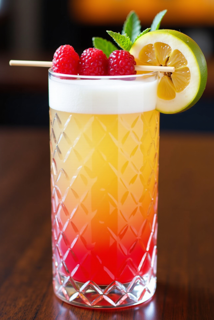 This bold and fanciful sour delights with layers of bright fruit and a smooth, festive foam, making it a real crowd-pleaser and a must-try for creative cocktail fans.