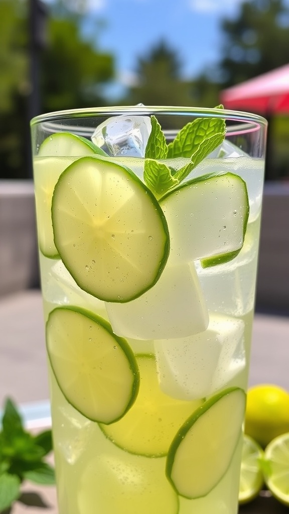 Visualize yourself relaxing in the sun, with a Sparkling Lime Cucumber Drink in hand, surrounded by a bright outdoor setting.