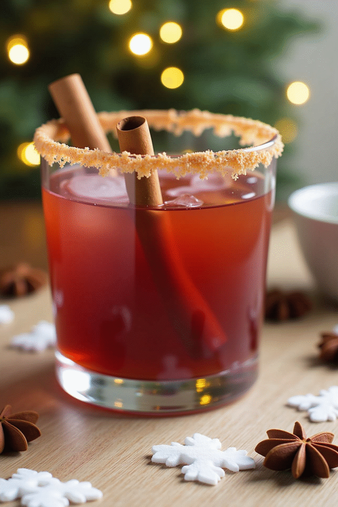 Shake together premium tequila, triple sec, freshly squeezed lime juice, a splash of orange juice, and your homemade spiced syrup over ice. Strain into glasses rimmed with a festive mix of cinnamon and sugar, and garnish with an orange slice and cinnamon stick for a beautiful presentation that matches the holiday mood.