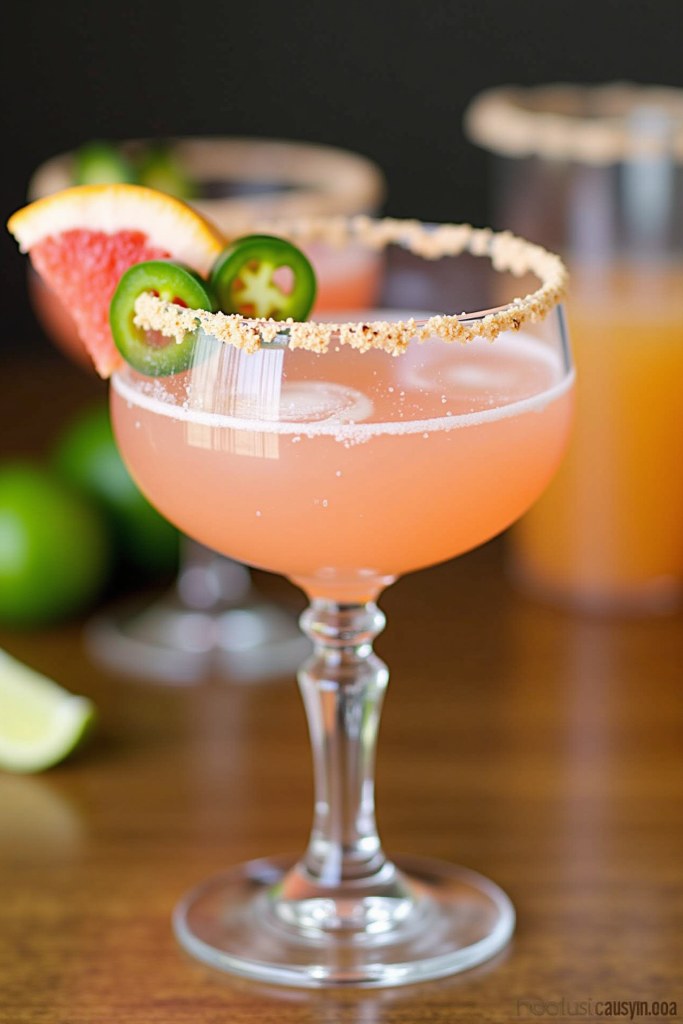 - Garnish with a wedge of grapefruit and extra jalapeño slices. Serve immediately and enjoy the fiesta!