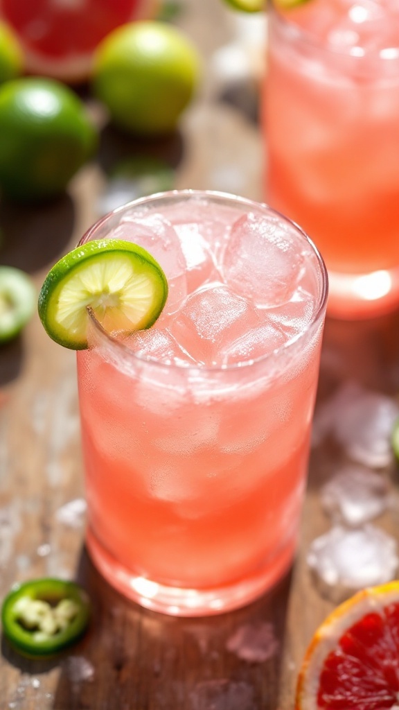 The attention to detail in presentation is enhanced by garnishes like a lime wedge and a slice of jalapeño, adding both color and a hint of spice. When paired with a rustic wooden table adorned with fresh limes and jalapeños, this drink embodies the essence of summer relaxation and enjoyment.