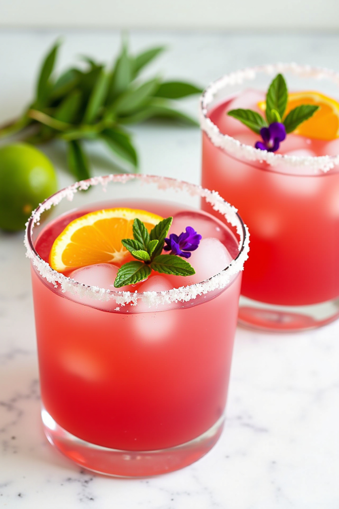 - Garnish with an orange wheel, a sprig of mint, and (if desired) a few edible hibiscus petals.